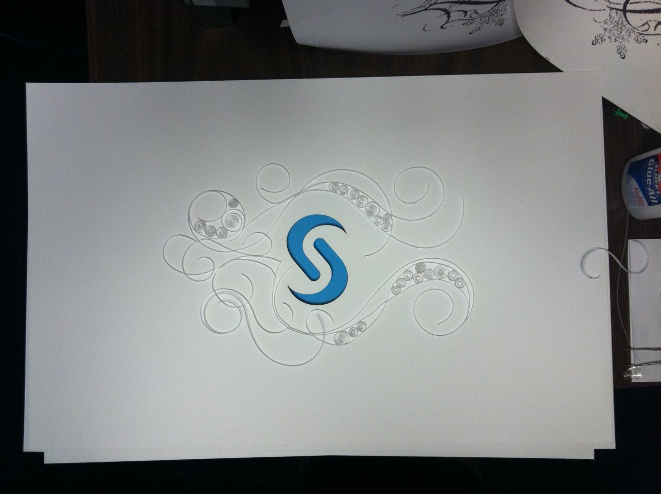 Assignment: Holiday Card. I was inspired by Yulia Brodskaya's quilling illustrations and used this method to convey a data flurry. I designed the swirls and twirls on the computer and transferred the design to a poster board with a laser cut company logo. The swooping and rolled paper strips were then glued to the board. Once everything was in place, it was photographed and then edited in Photoshop. The watercolor touches to the background and the snowflake cutouts were added in Photoshop.